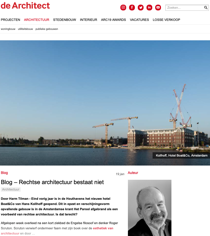 Door Harm Tilman - ''Eind vorig jaar is in de Houthavens het nieuwe hotel Boat&Co van Hans Kollhoff geopend. Dit in opzet en verschijningsvorm opvallende gebouw is in de Amsterdamse krant Het Parool afgebrand als een voorbeeld van rechtse architectuur. Is dat terecht?'' (source: DeArchitect)
