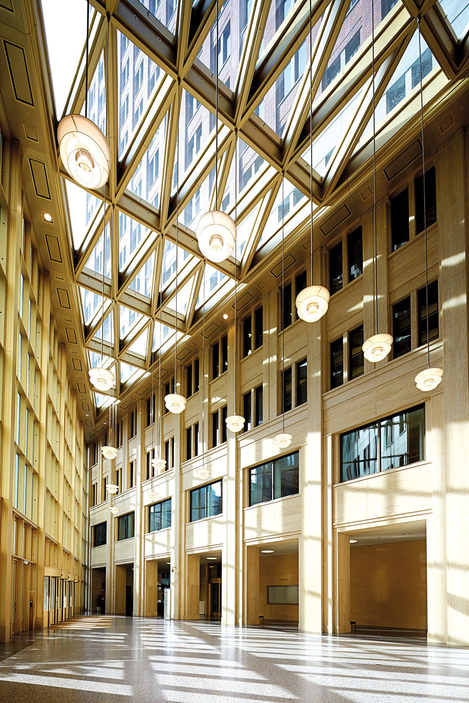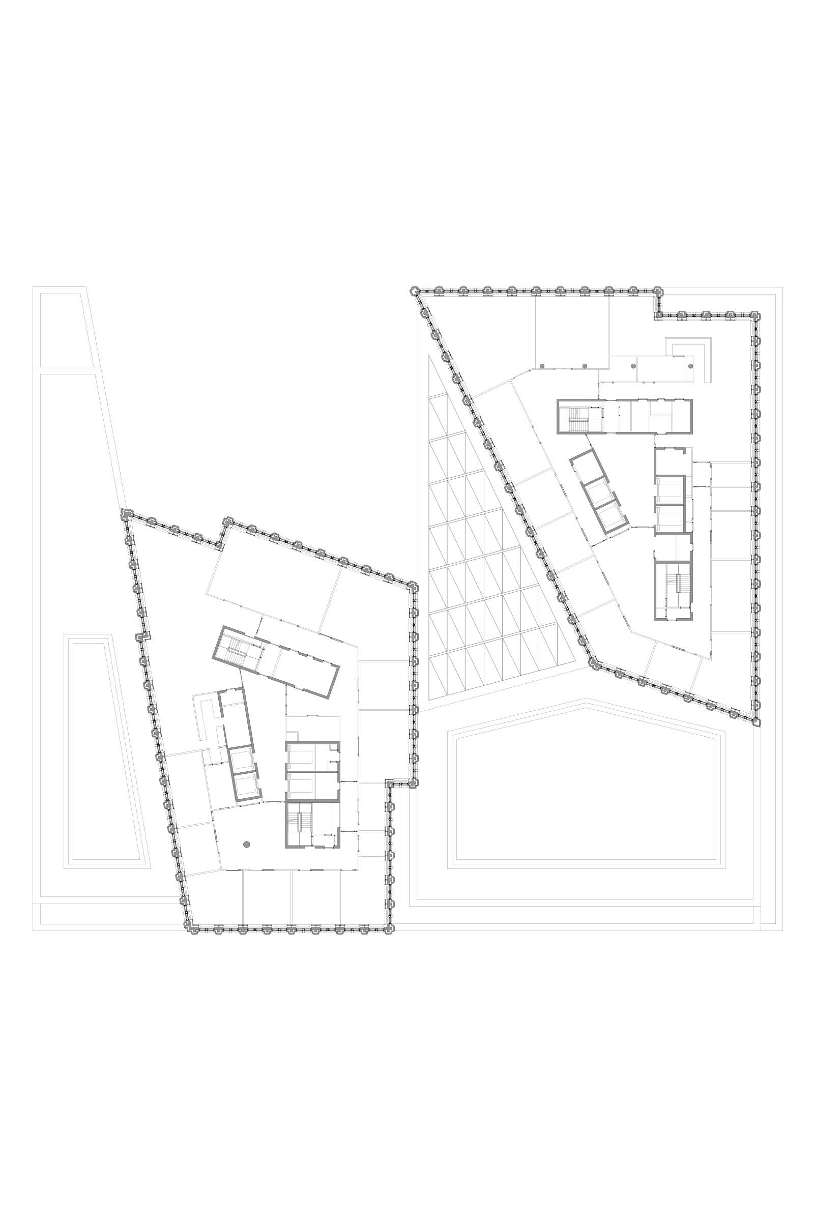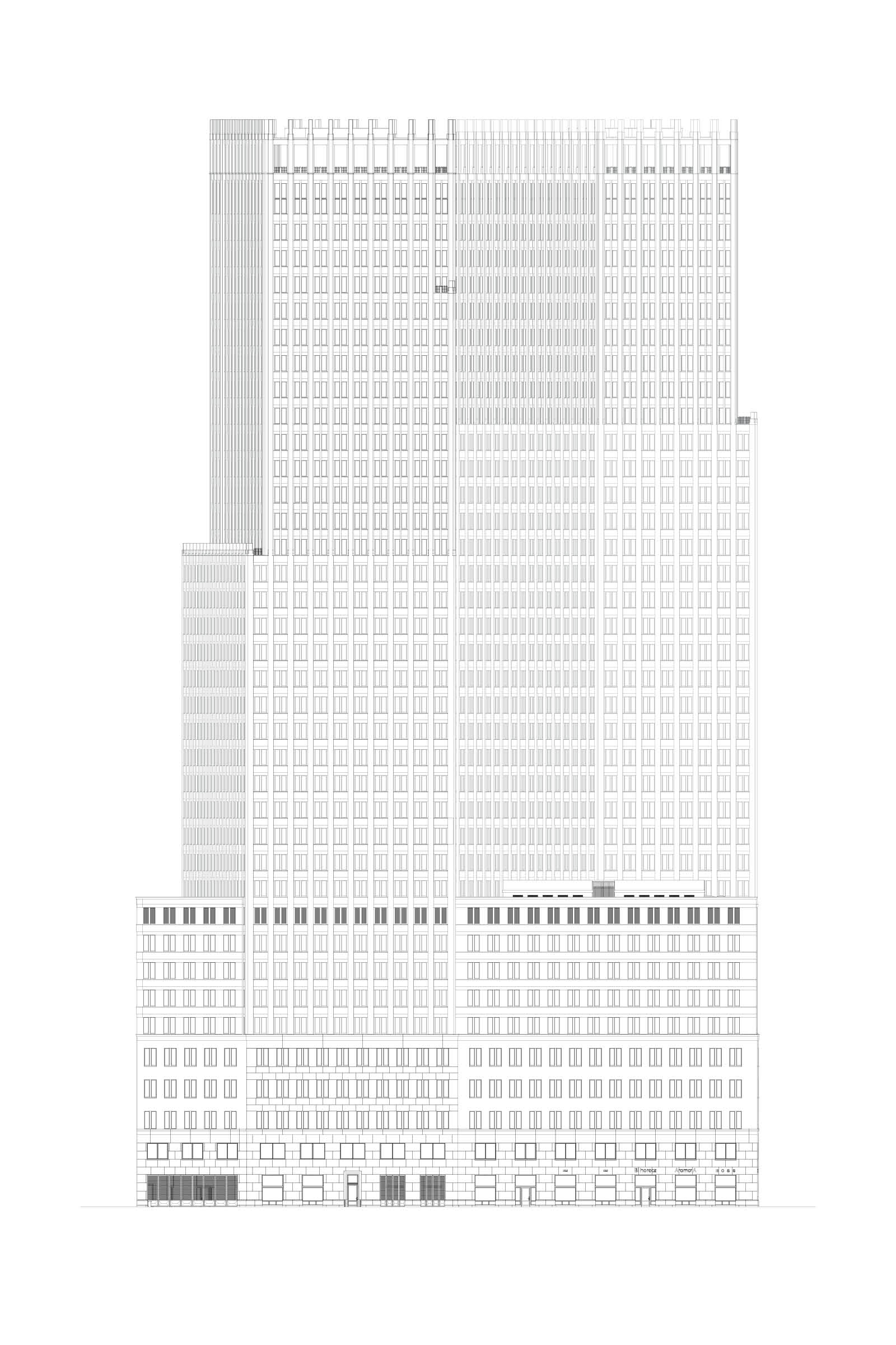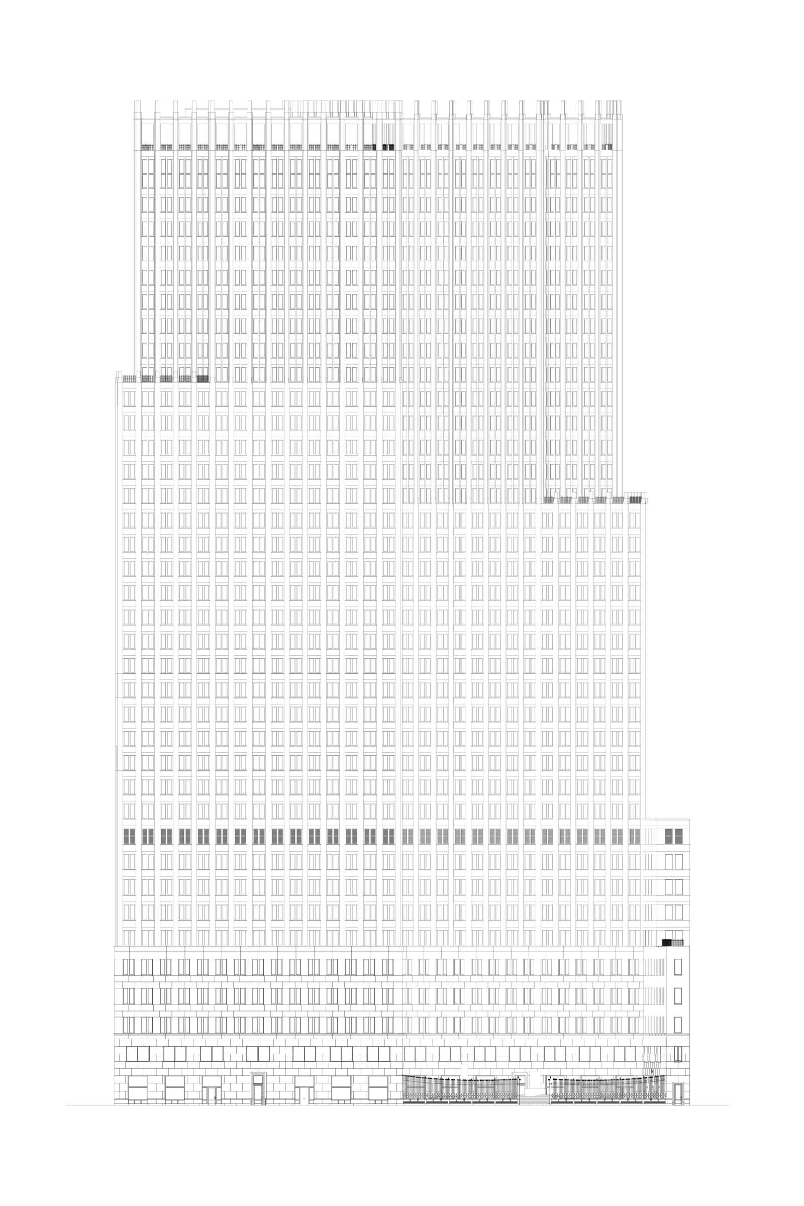 This effectively emphasizes the expression of stability, which is also the intention of the bush hammered plinth. The rather flat facade of the first two floors overlooks the street with wide openings and connects to the ground with a curved profile, while terminating in a fine stringcourse. The display windows of the shop fronts are framed with brass-colored aluminum profiles. The facade of the second to the fourth floors culminates in a high main cornice, which accentuates the building’s granite base and the common functions of the ministries. Here, the same box windows that are positioned between the pillars in the towers above are used as separate openings. The double windows allow for natural hand-adjustable ventilation throughout the building. Made with prefab the towers’ facades are articulated with pilasters that, clad in the same polished green granite of the base, break past the top edge of the wall and terminate in a crown. The joints between the elements disappear behind the overlapping panels, becoming invisible when viewed head-on.