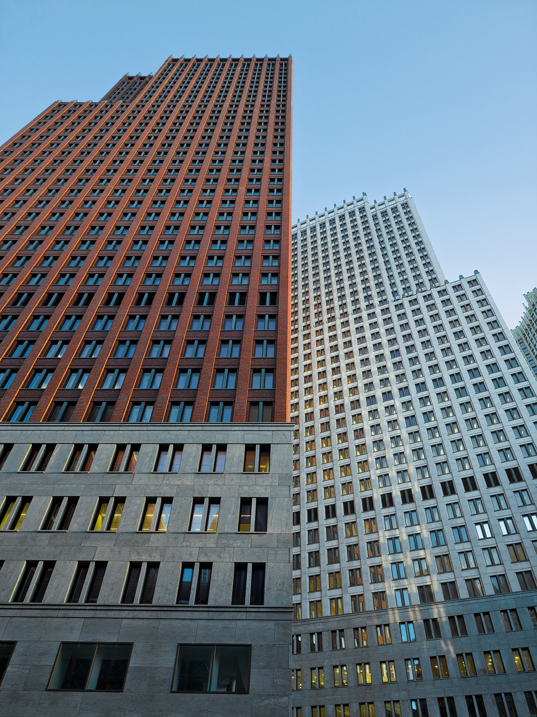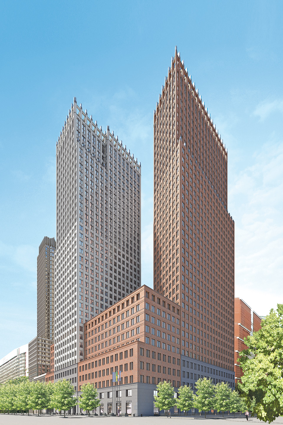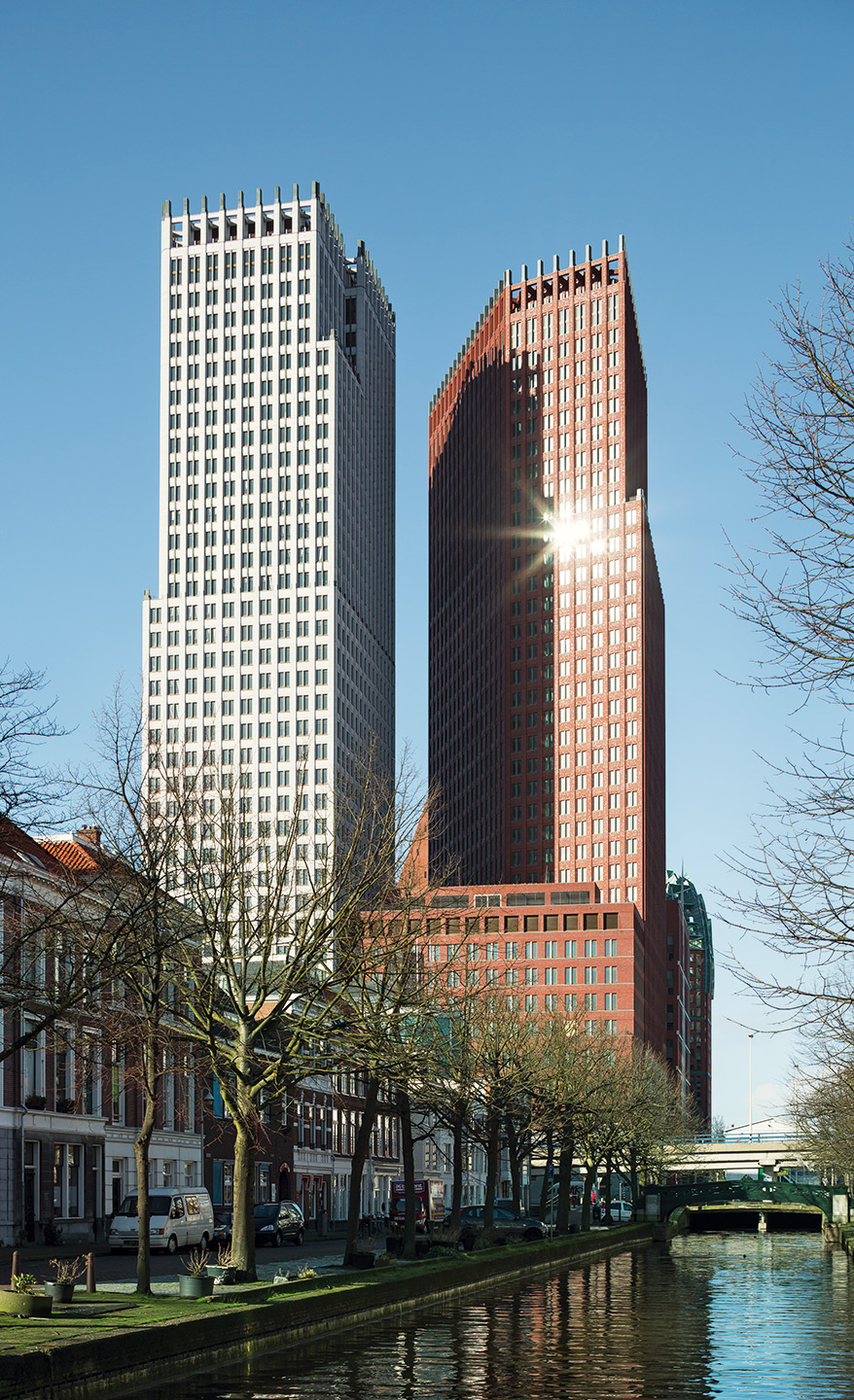 The project originated from an international competition held in 2002. The pair of towers rise up from a block that opens towards the pedestrian street called Turfmarkt with a cour d’honneur cum garden. With their 36 floors standing 150 meters tall, the ministries’ towers stand out in the urban context with pilaster-facades of brick (for the Ministry of the Interior) and granite (for the Ministry of Justice). The grey-green granite cladding of the base, made up of four-centimeter thick sandblasted slabs, is fixed to the bearing wall via conventional stainless steel anchors with thermal insulation in between. At the corners of the ground floor, thicker slabs with an L-shaped section have been used supported by steel consoles.