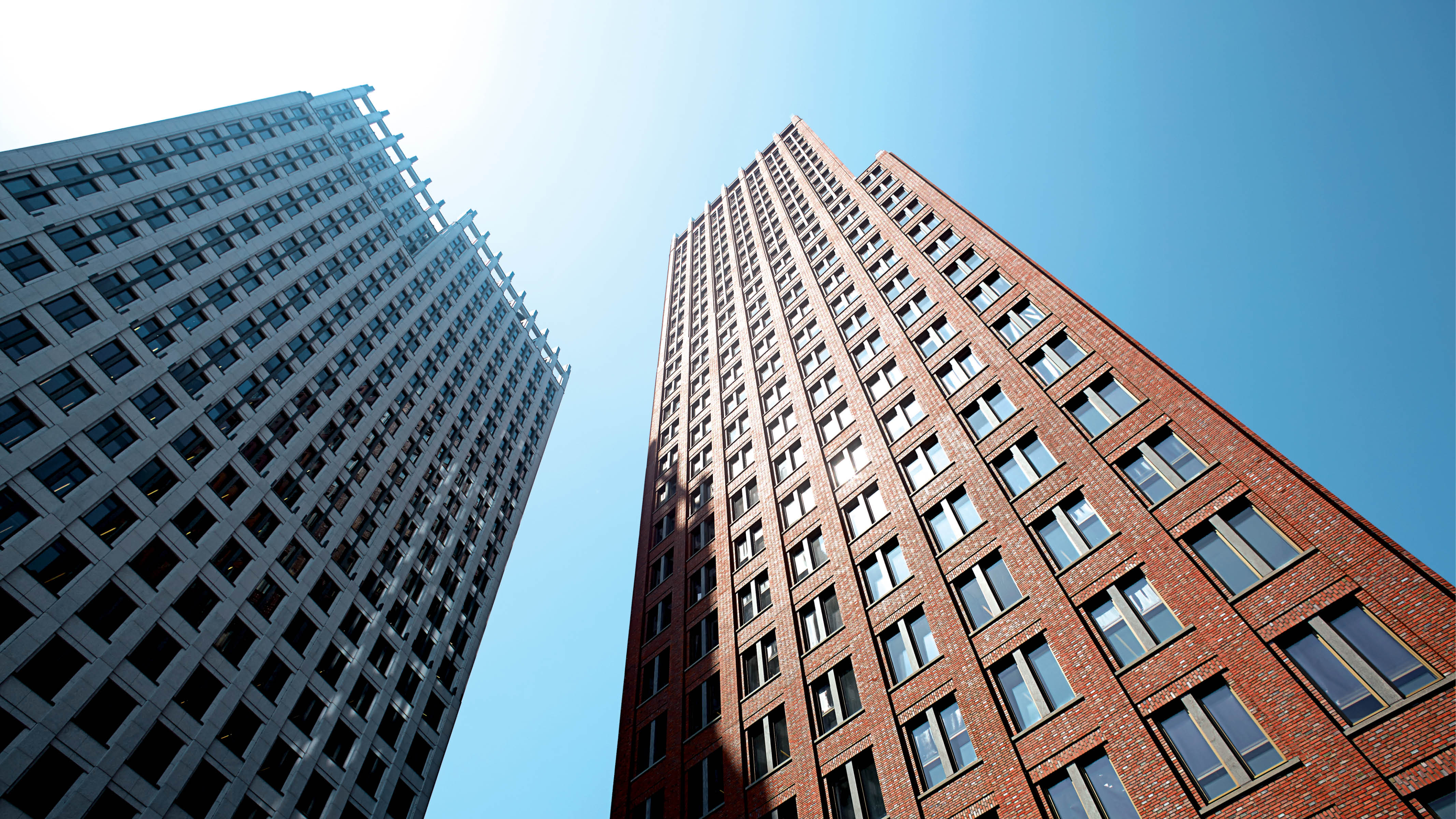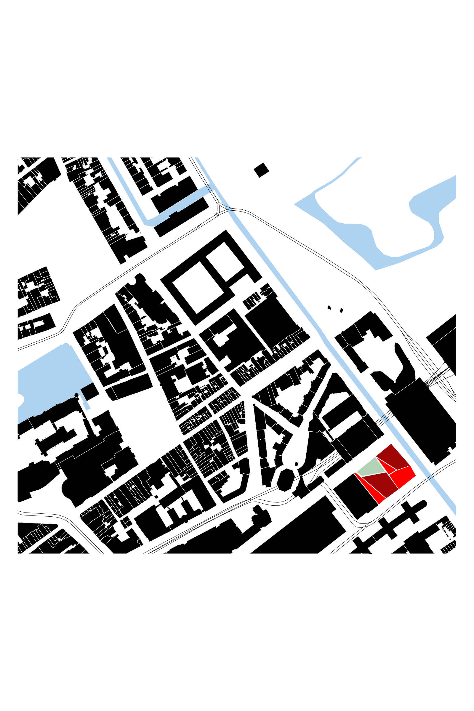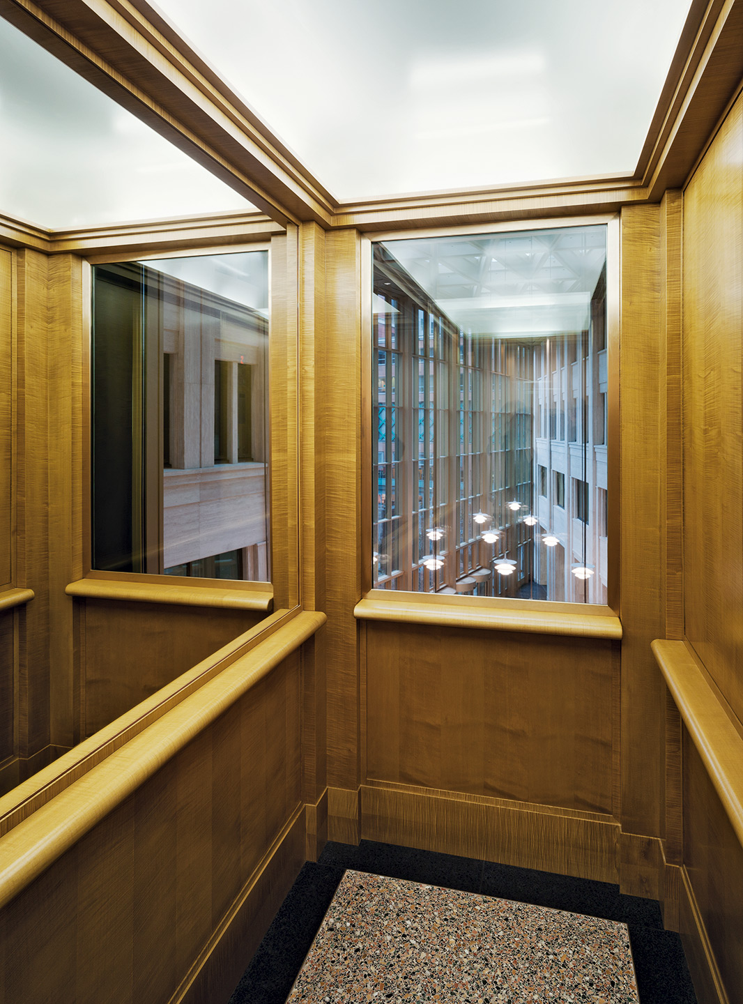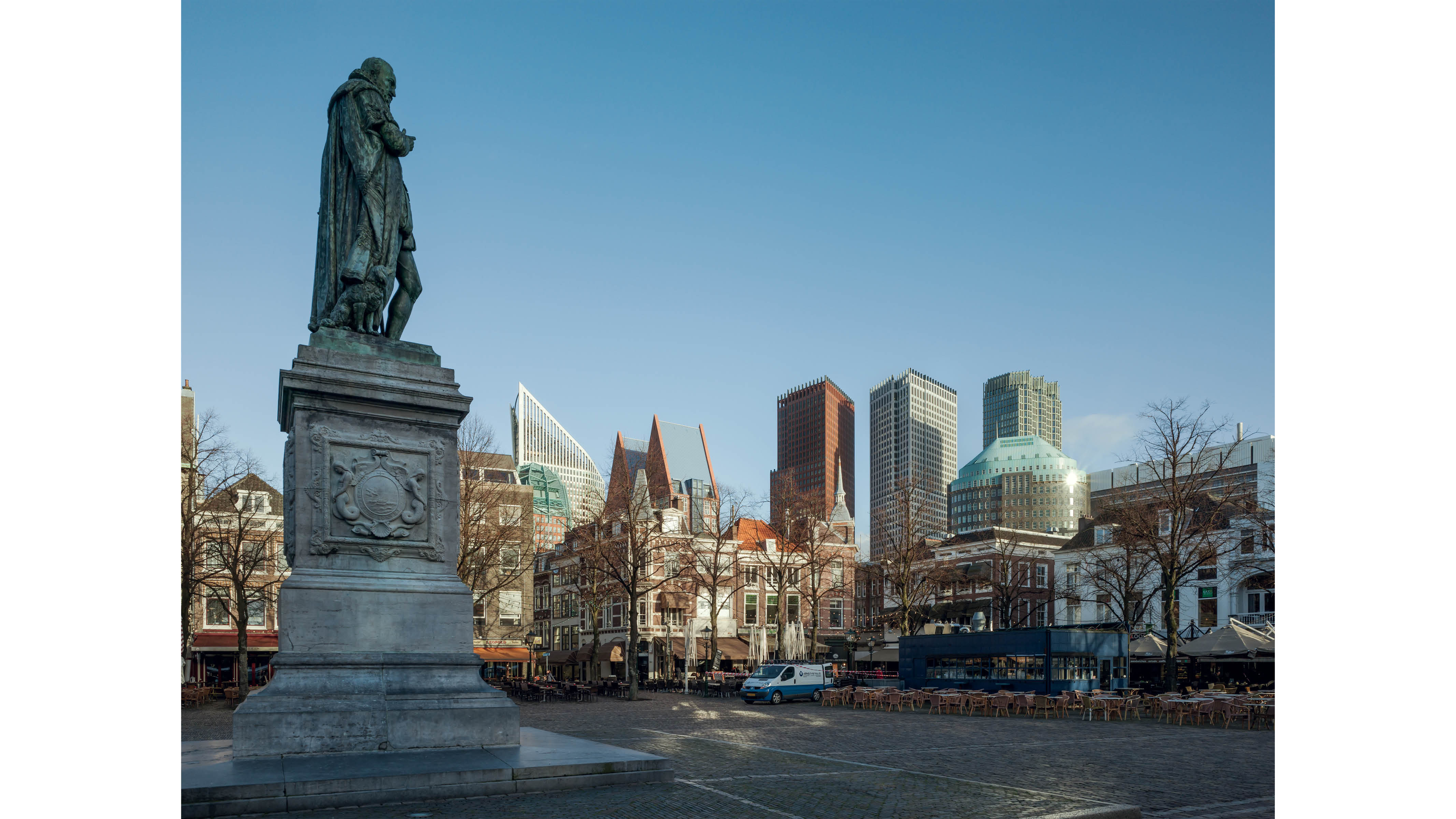 The project originated from an international competition held in 2002. The pair of towers rise up from a block that opens towards the pedestrian street called Turfmarkt with a cour d’honneur cum garden. With their 36 floors standing 150 meters tall, the ministries’ towers stand out in the urban context with pilaster-facades of brick (for the Ministry of the Interior) and granite (for the Ministry of Justice). The grey-green granite cladding of the base, made up of four-centimeter thick sandblasted slabs, is fixed to the bearing wall via conventional stainless steel anchors with thermal insulation in between. At the corners of the ground floor, thicker slabs with an L-shaped section have been used supported by steel consoles.