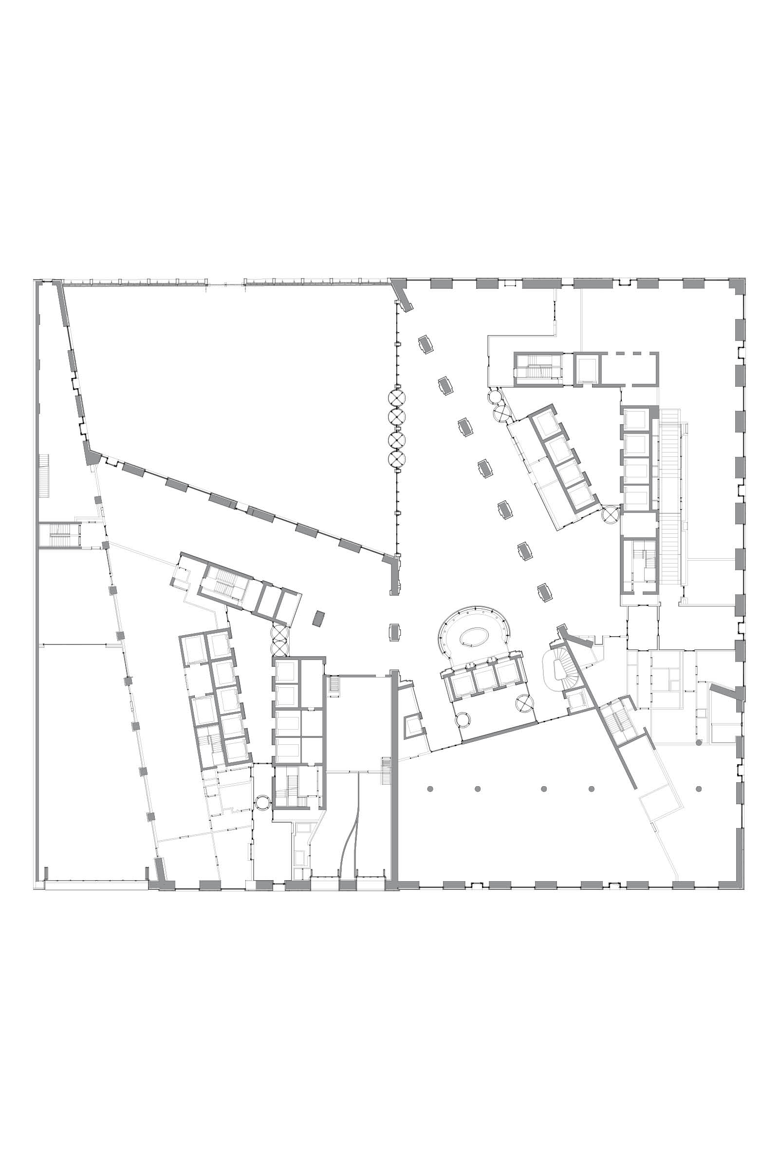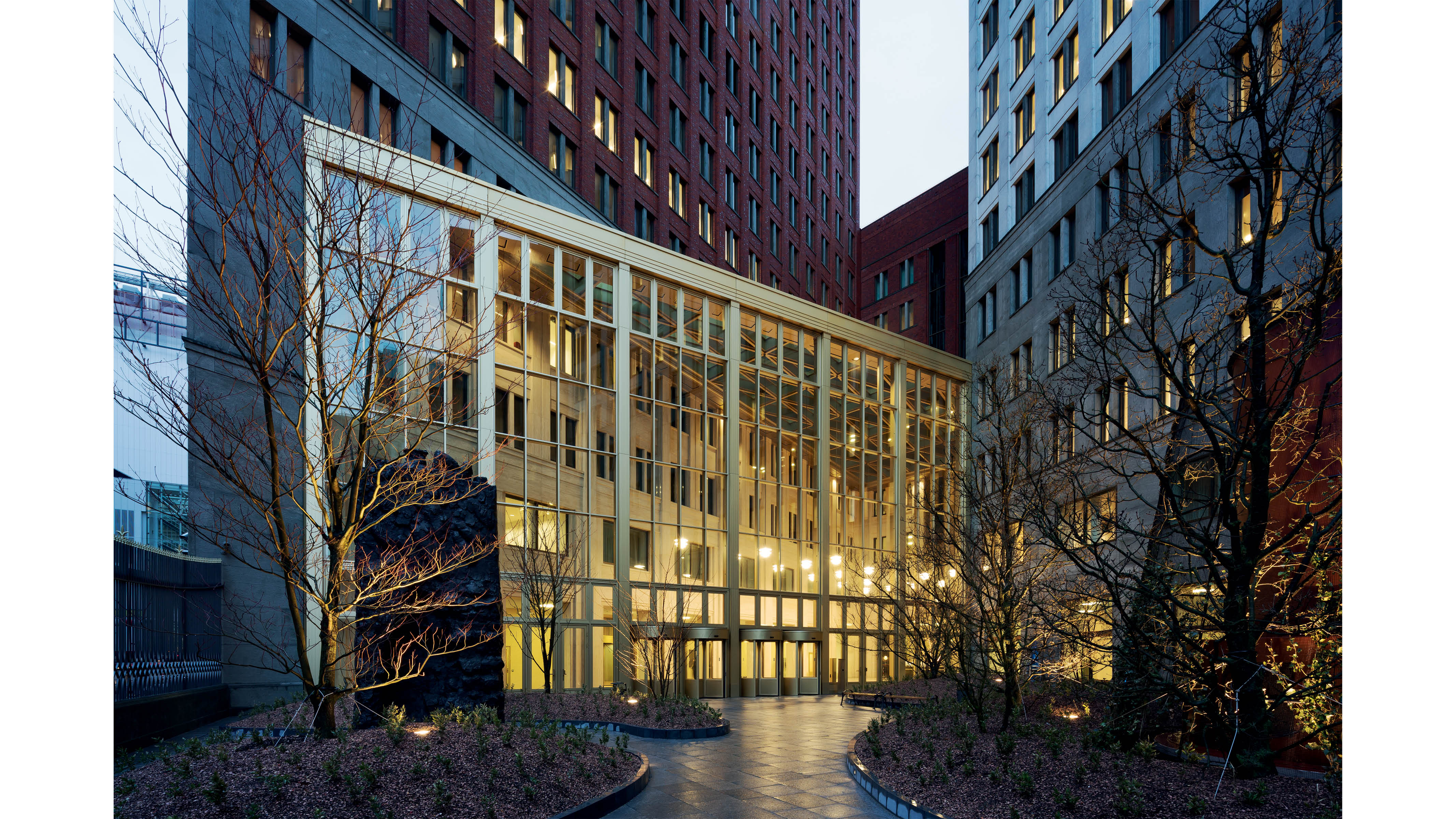 Cut into the block, the steeply angled atrium has a main glazed front that gives onto the garden with revolving doors and brass-coloured aluminium profiles. The garden is enclosed by a granite bench that protrudes from the building’s plinth. This bench supports a fence made of ornamentally treated square posts and curved rectangular steel profiles coated with a bright anthracite color. The tips are lacquered in gold.