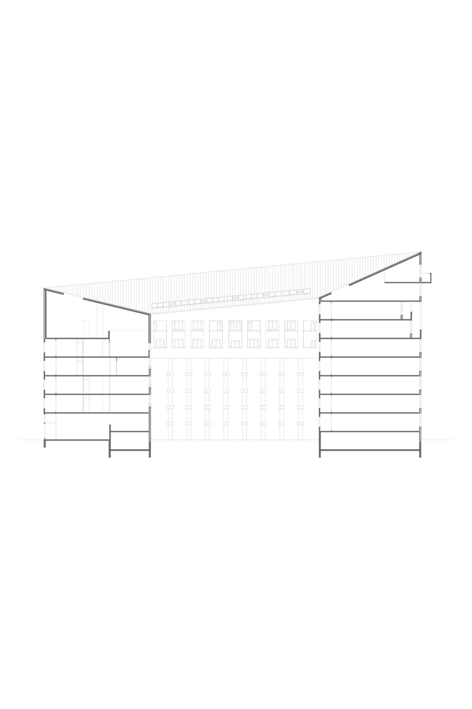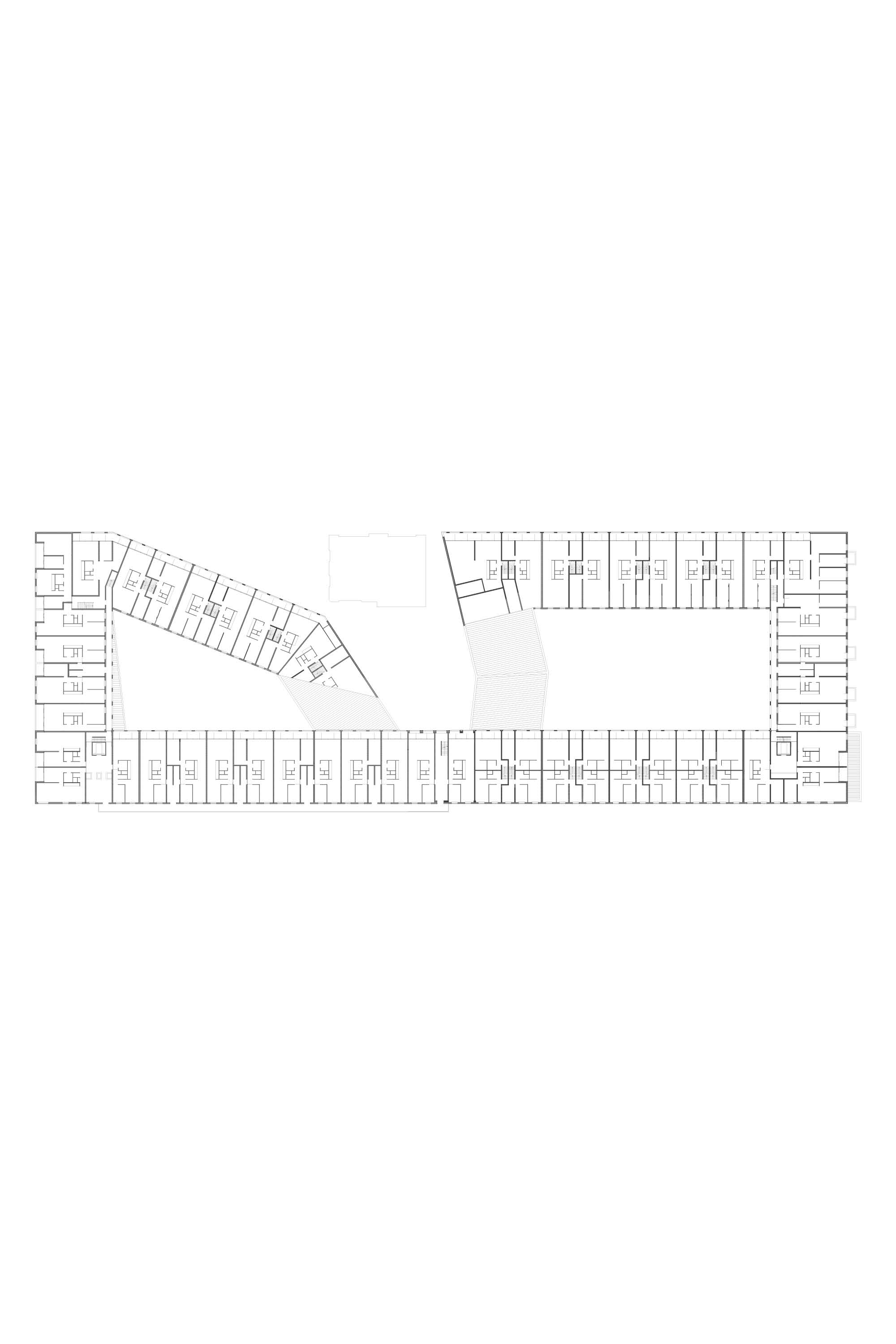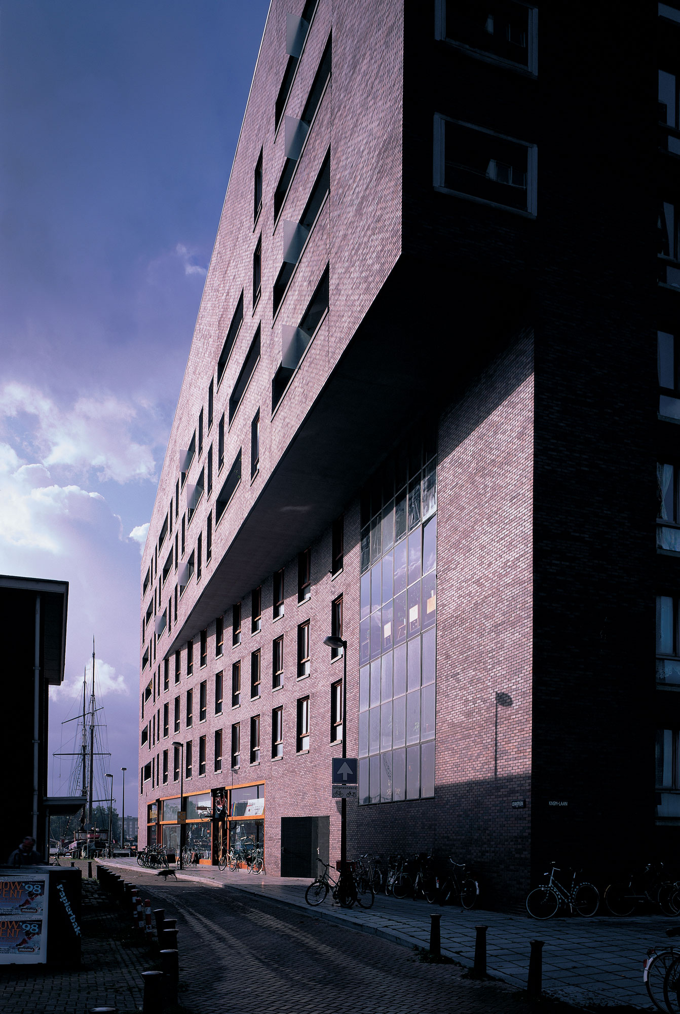 The transformation of the closed building block into a folded mass followed a number of functional requirements: sunlight, view, respect for existing buildings. The classic rectangular building block was distorted and shaped into a building with a tough and self-assured character that fits the nautical character of this part of Amsterdam. The use of natural materials and careful craftsmanship give the building a familiar face.