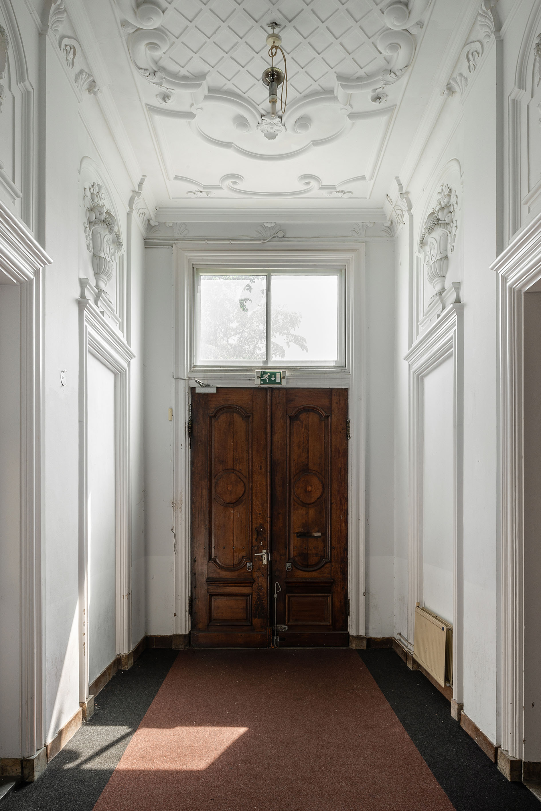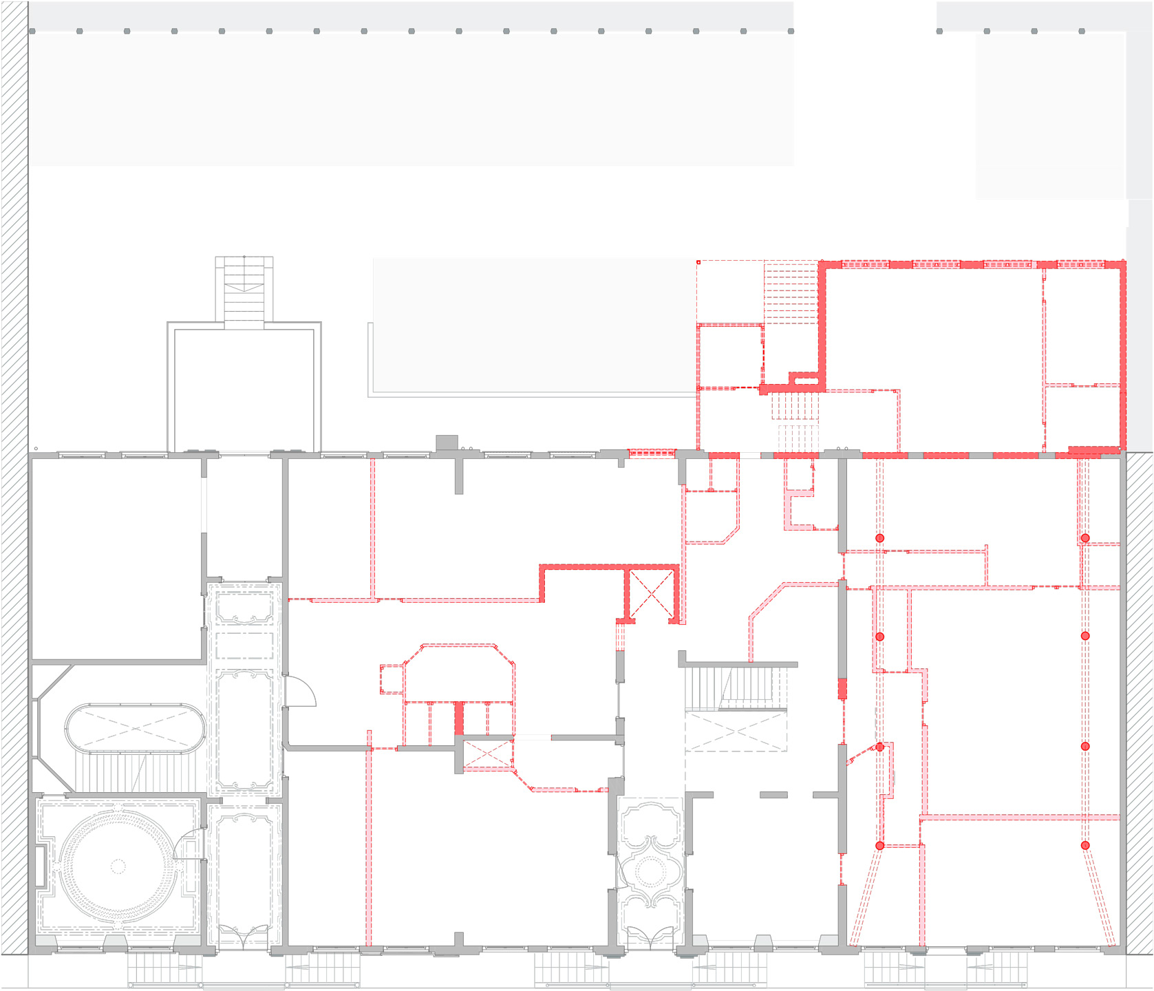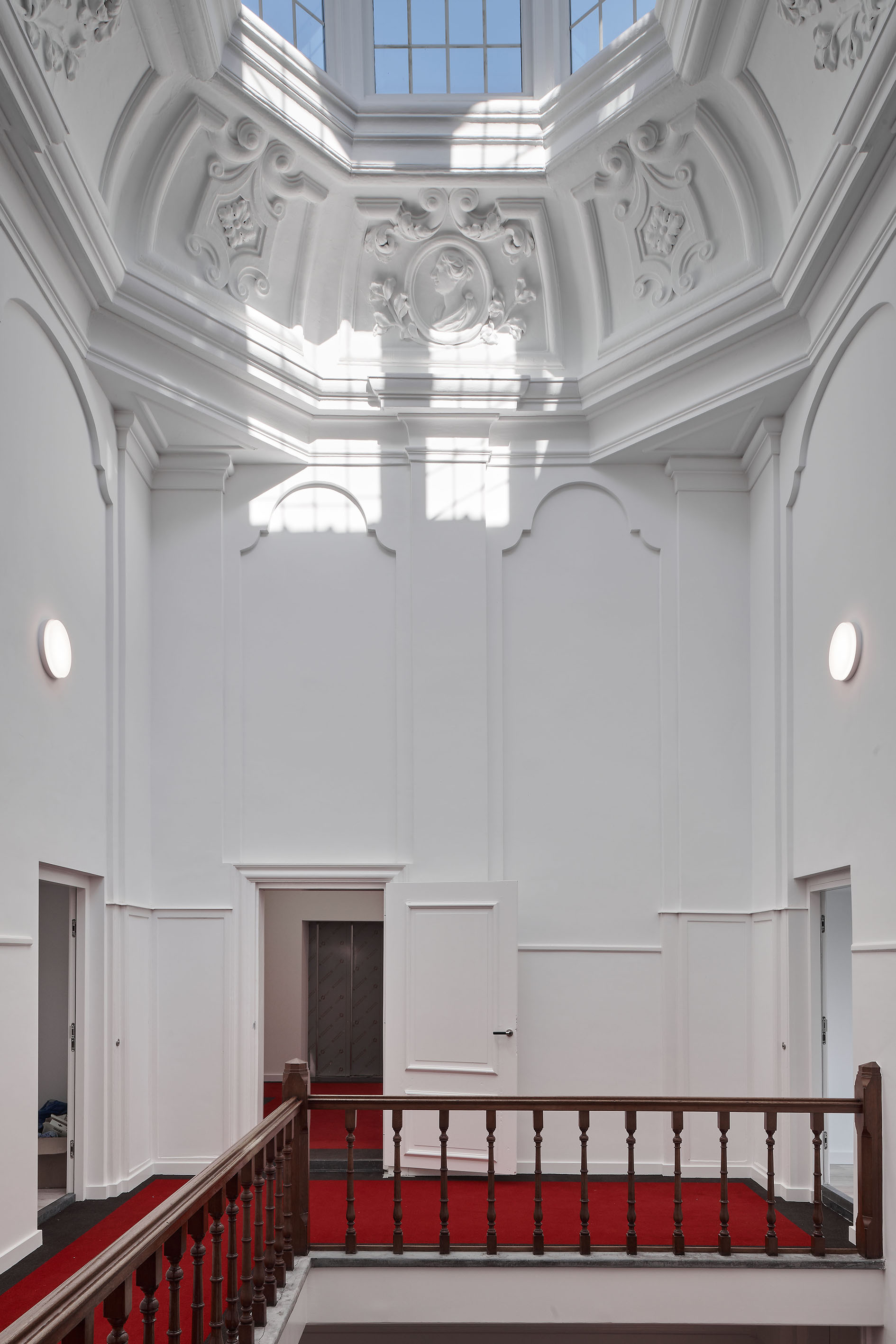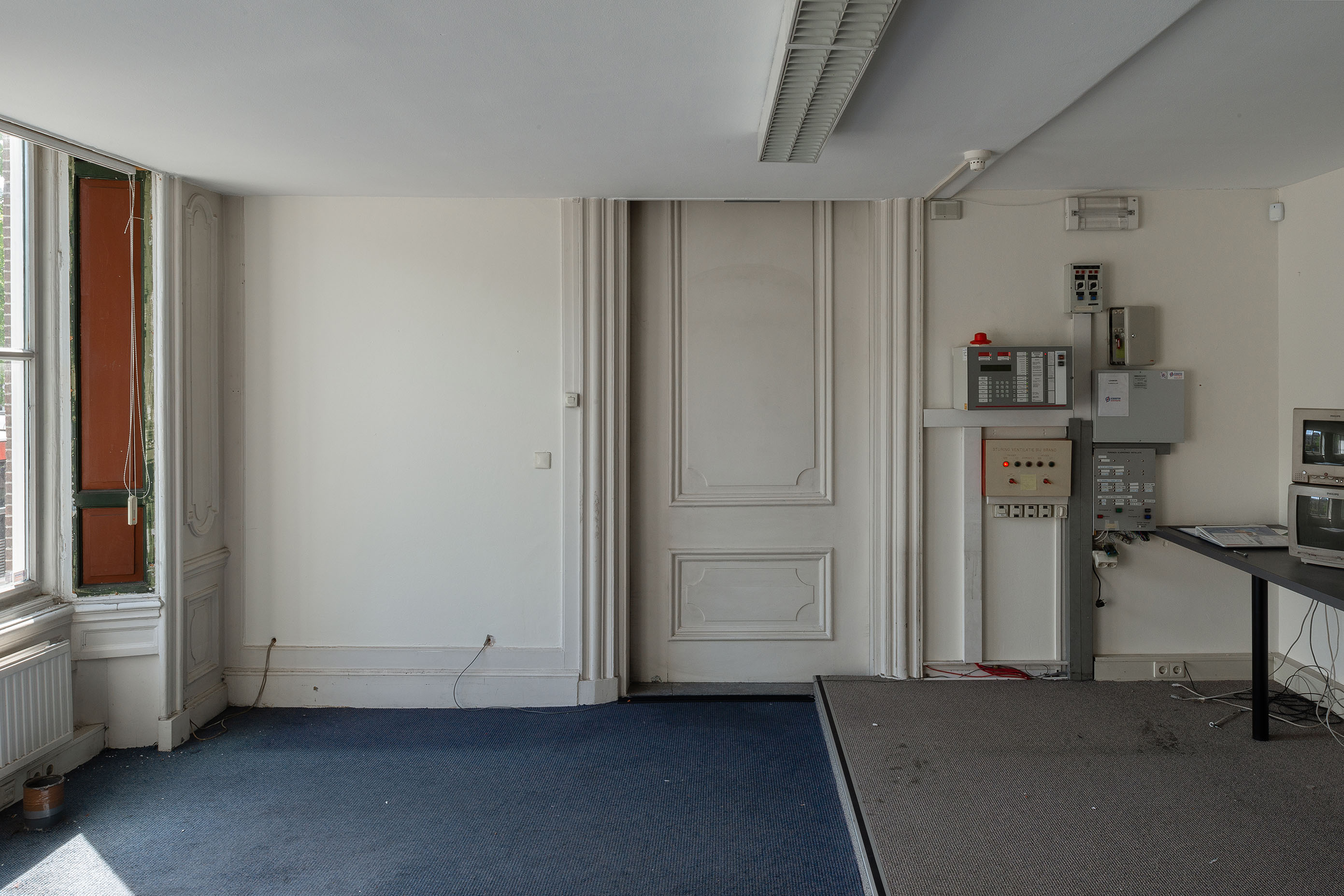 Internally, much had changed—especially in the buildings at Prinsengracht 69 and 71. A twentieth-century extension stood at the rear. The original garden had disappeared and was converted into a parking lot. Of the magnificent interior, only two rooms, one staircase, and the three fanlights remained. The three city palaces were cluttered with small rooms and corridors, and the spaces, up to five meters high, had been lowered with mezzanines and suspended ceilings. The rear was cluttered with various twentieth-century extensions.