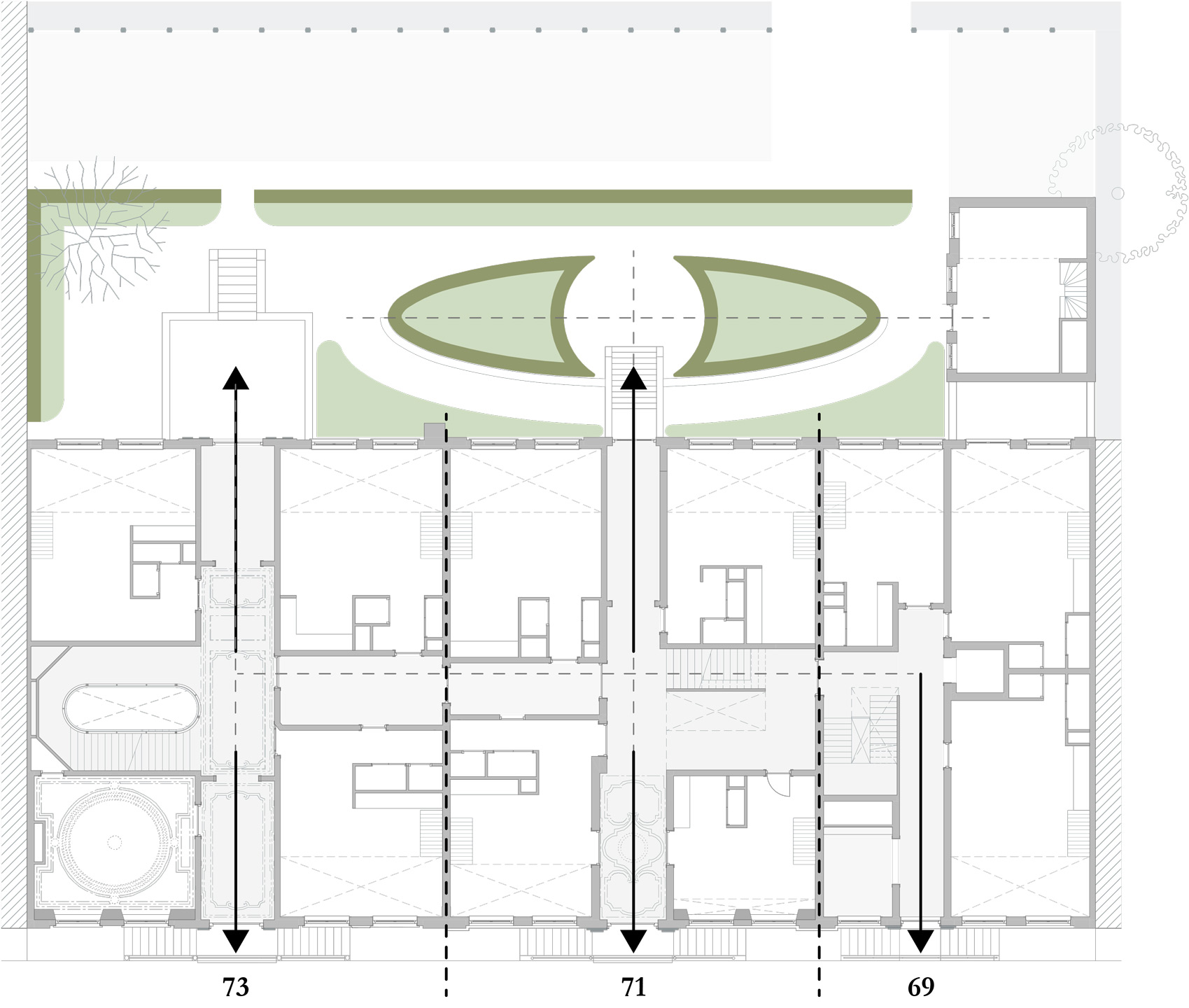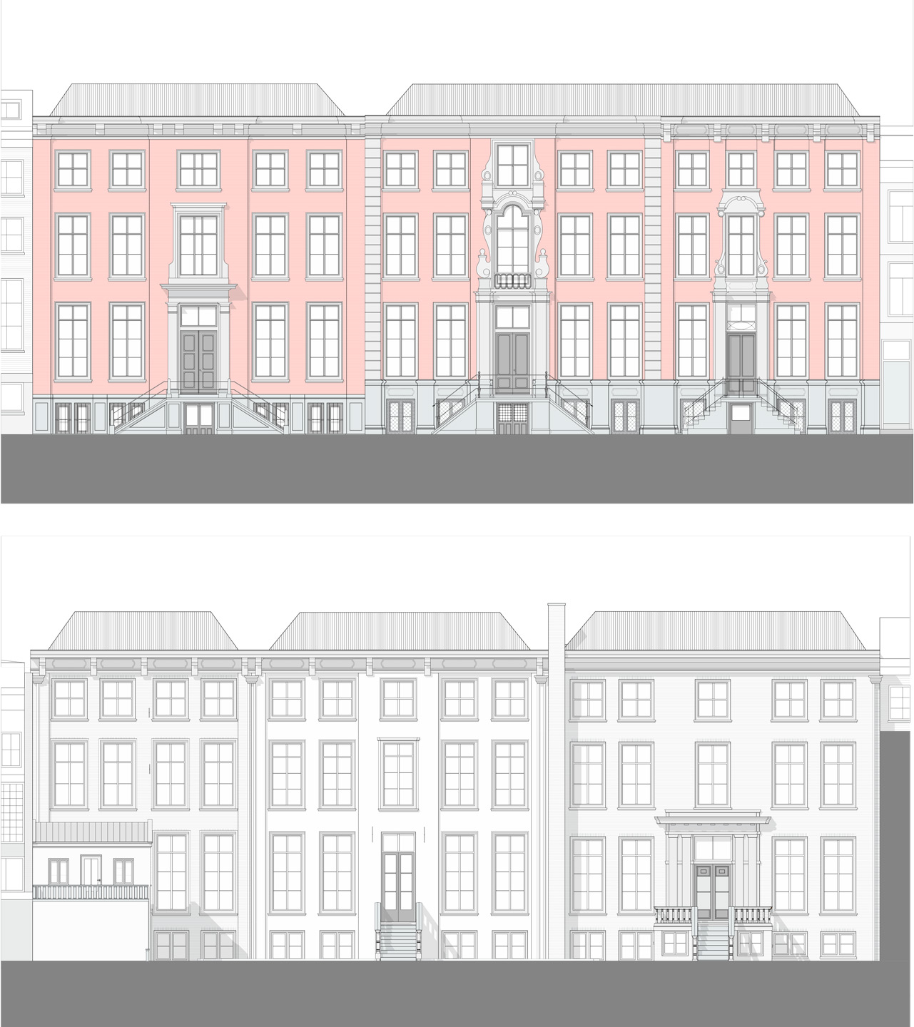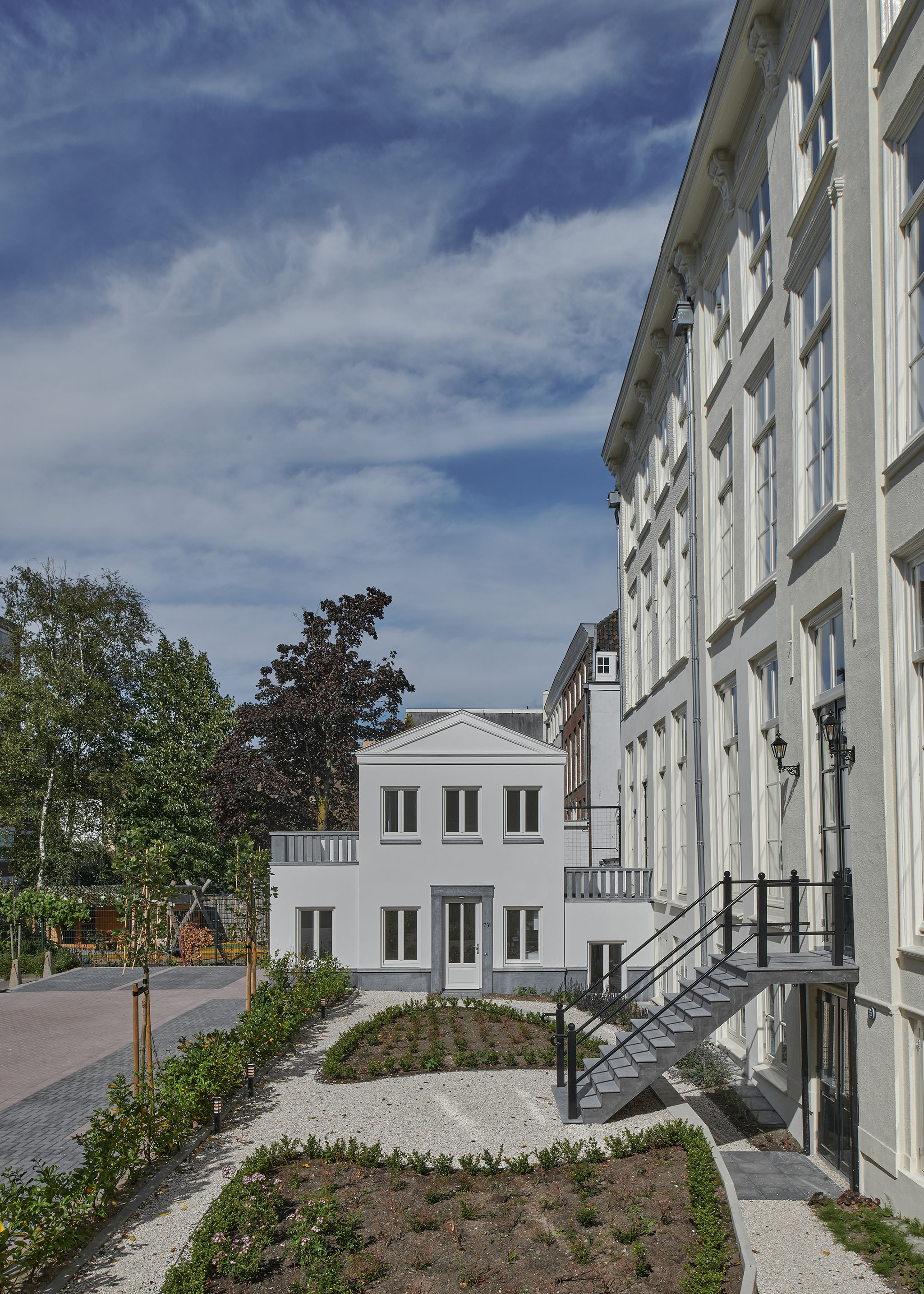 The chosen approach was to "clean up" the structure of the three buildings and make it readable again, both inside and out. The three entrances have been restored to their former glory and now have access to the garden. The front facade was restored in such a way that the subtle differences between the three buildings were made visible again by restoring windows and ornamentation and introducing subtle color variations between them. Half of the parking lot at the rear was freed up for a communal garden. And the extension has been replaced by a smaller "garden house" that recalls the vanished coach houses and garden houses that visually terminated the deep gardens in the eighteenth century.