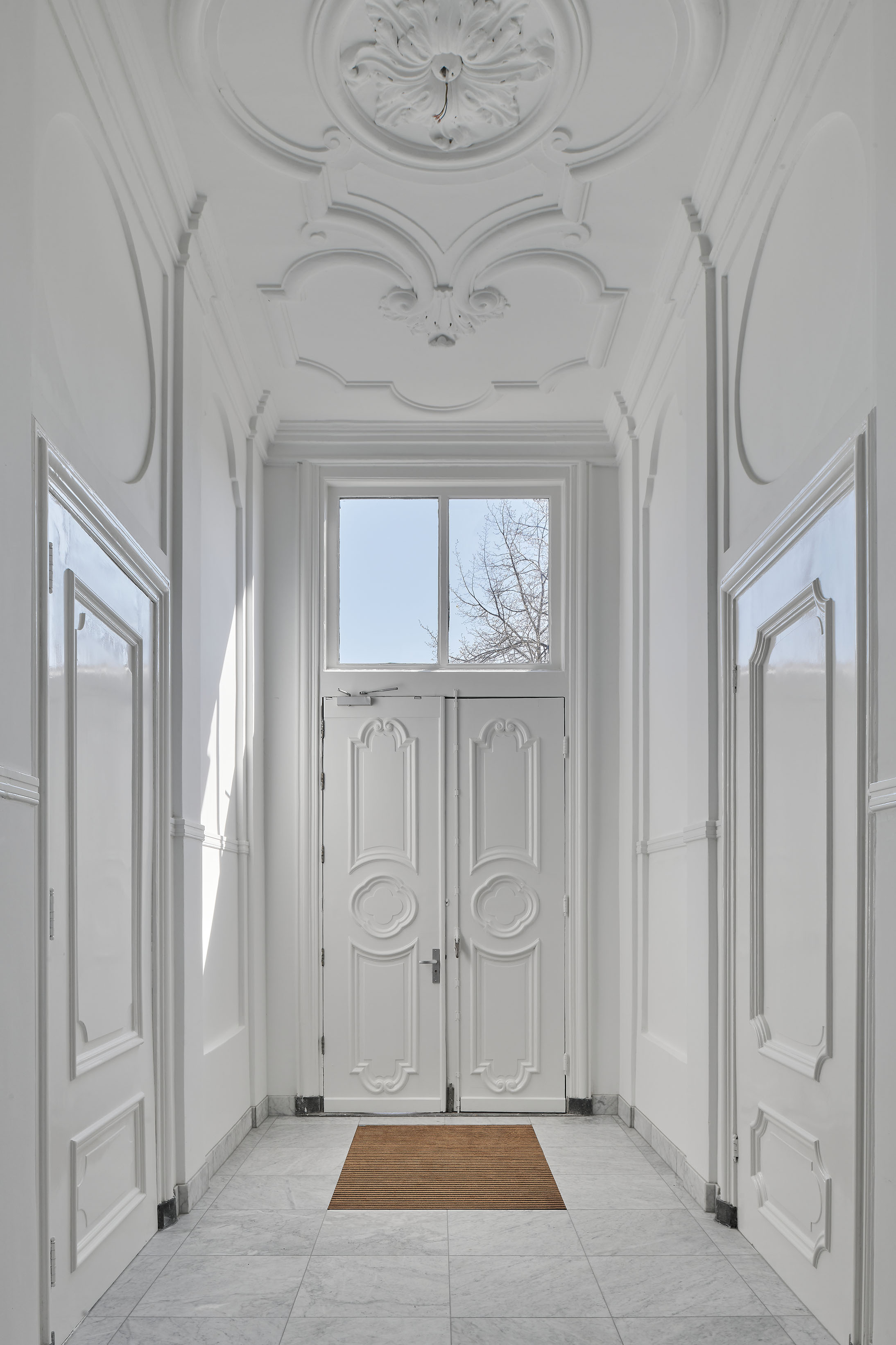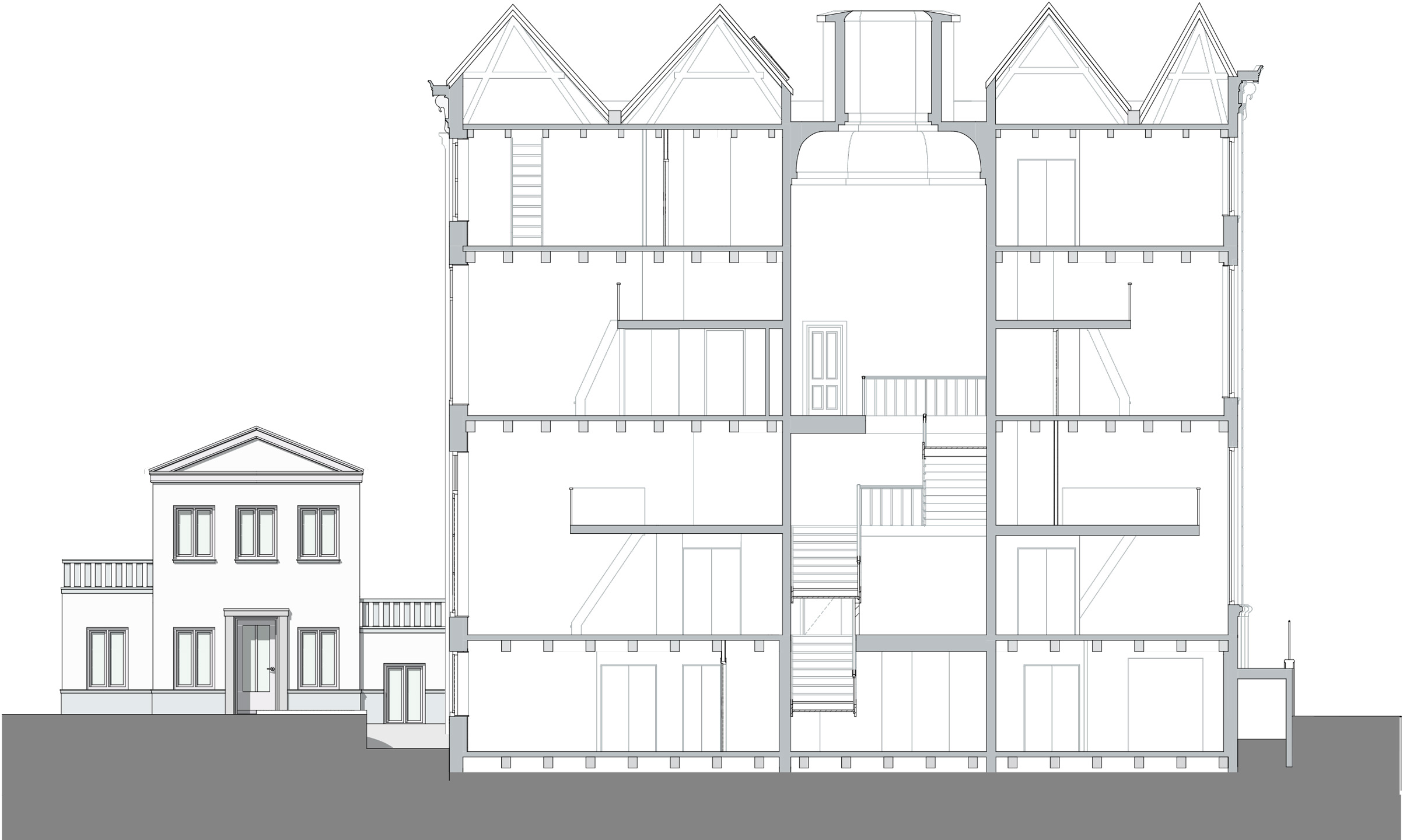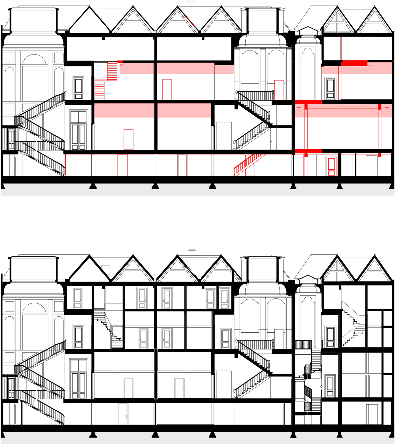 The chosen approach was to "clean up" the structure of the three buildings and make it readable again, both inside and out. The three entrances have been restored to their former glory and now have access to the garden. The front facade was restored in such a way that the subtle differences between the three buildings were made visible again by restoring windows and ornamentation and introducing subtle color variations between them. Half of the parking lot at the rear was freed up for a communal garden. And the extension has been replaced by a smaller "garden house" that recalls the vanished coach houses and garden houses that visually terminated the deep gardens in the eighteenth century.